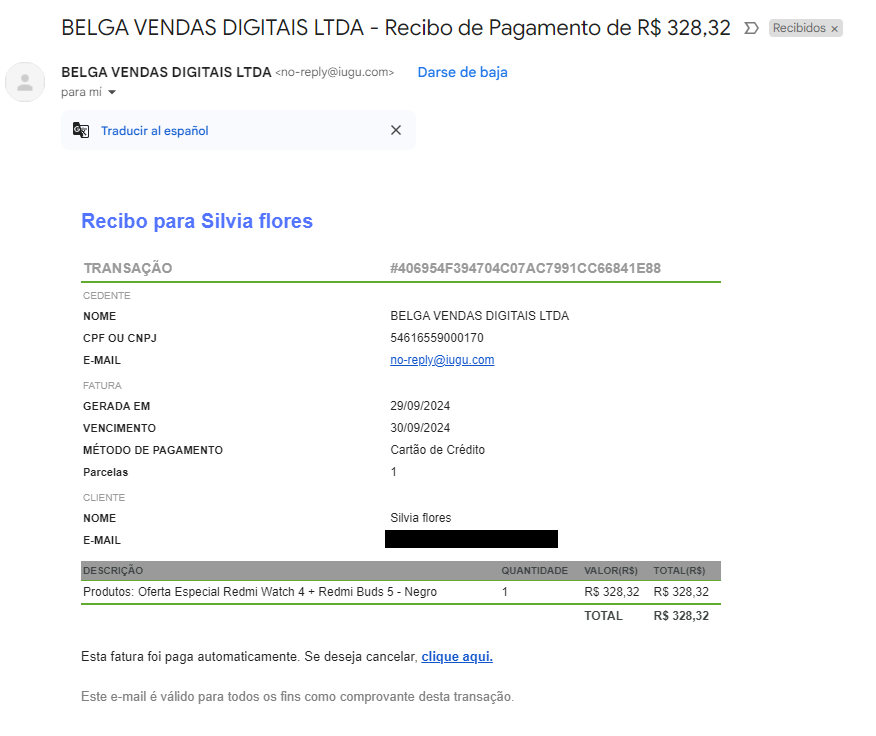 Al realizar la compra y al procesarse el pago te llega un correo con el resumen de lo que compraste, como todo proceso de compra. Pero la diferencia con este correo era que estaba en portugués. Es decir, la promoción era de Xiaomi Argentina [Cuenta falsa], pero el resumen de la compra apareció en portugués.